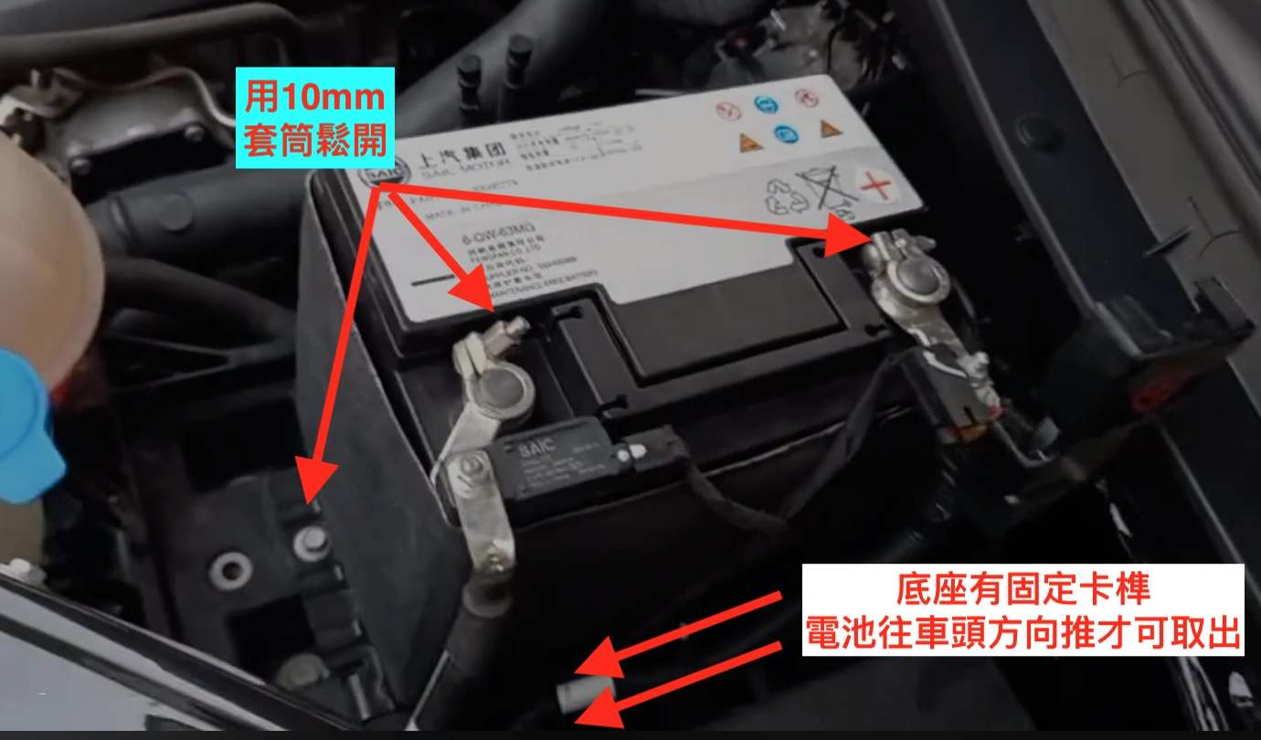 - 使用 10mm 套筒解開電池底座固定螺絲,移除螺絲及壓板。