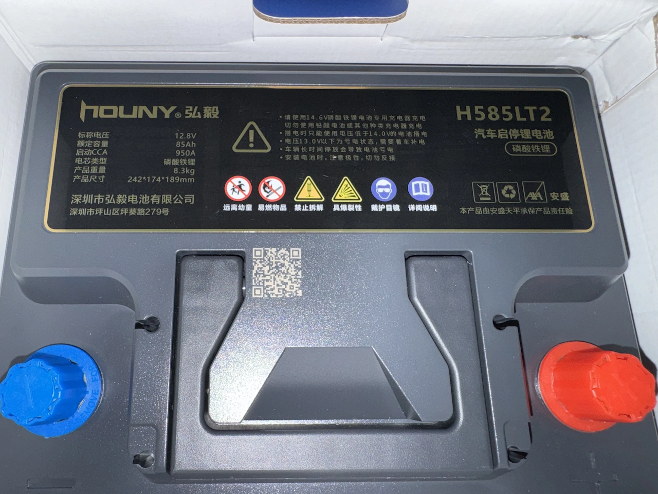 弘毅2025年改版之後,產品線分為金階、藍階、綠階三個系列,這次購入的是 85Ah 金階。同系列LN2規格還有 100Ah 可選,但考量到車友的 HS 屬於全原廠設定,僅作為假日用車,並無重度電系改裝需求,加上鋰鐵放電深度 (Depth of Discharge, DoD) 更深,可用容量是鉛酸的 1.6 倍,85Ah 鋰鐵相當於 130Ah 鉛酸,已相當足夠。
