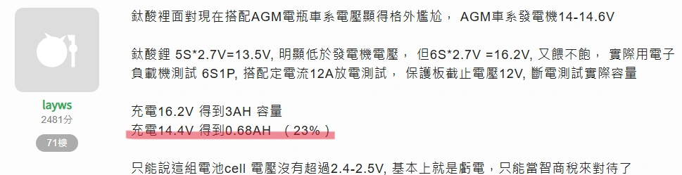 | 6串 | 13.8~14.4V | 約16.2V(2.7V/顆) | 12V~16.2V | 充不飽容量過低(發電機電壓不夠) |